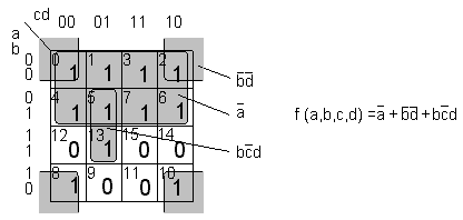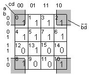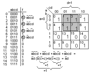 Frames "1" "3" "5" "7" is a group of four frames with "1" that are "neighbors" to each other. Here too, the four minterms could be reduced to a term that expresses what is common for the frames, namely that a = 0 and d = 1. Everywhere in Karnaugh map where one can find such groups of four ones such simplifications can be done, grouping of four.