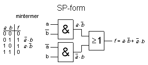 En funktion av två variabler har tre ettor i sanningstabellen. Man kan då uttrycka funktionen på SP-form med tre mintermer. Detta är långt ifrån det enklaste uttrycket för denna funktion ( du kanske redan har känt igen funktionen som OR-funktionen? ). Med Booles algebra kan funktionen förenklas.