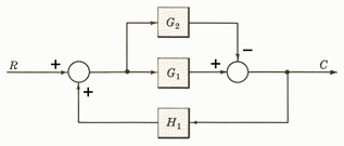 Förenkla överföringsfunktionen  GTOT=C/R  till ett enda block med hjälp av reduktionsreglerna för blockschemor.